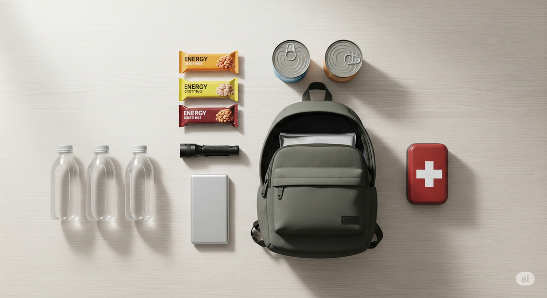 • 飲料水(500mlペットボトル数本)、非常食(カロリーメイトなど)、救急セット、懐中電灯、モバイルバッテリー、現金(小銭も含む)、軍手、雨具